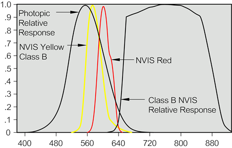 Figure 4.1.0-C shows the normalized spectral radiance curves for the Type I Class B colors of NVIS Yellow Class B and NVIS Red, the relative photopic response and the spectral response of the Class B NVIS. The NVIS Red is allowed in a Class B cockpit in addition to NVIS Blue, NVIS Green A, NVIS Green B, NVIS White and NVIS Yellow Class B.