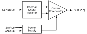 The NEXSYS Current Sensor (CS1) is a Series A (4 Pin) solid-state, low-side direct current (DC) sensor developed to enhance avionics design flexibility by offering undercurrent and overcurrent detection. The CS1 compares electric current in a linear relationship between the specified setpoint and the current that is being monitored by the SENSE input. The fast-response output provides a discrete signal that transitions from Open to Ground when the input detects current that is above or below the specified setpoint, see Figure 2.5.2.0-A.